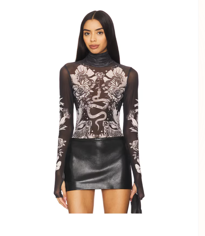 Paired with a nice skirt or pants, I could see myself hitting the town all night long. This top has a dark gray mesh base with a bold black and cream botanical print. The high neckline and thumbhole sleeves give it a sleek, fitted look, while the lightweight, semi-sheer fabric makes it perfect for layering.