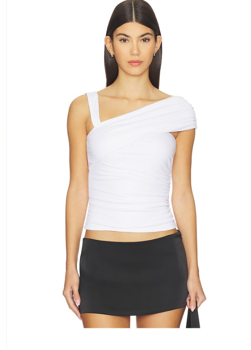 I like how this sleeveless top has a soft stretch feel with an asymmetrical neckline and one-shoulder strap. The draped front adds a nice touch, and it’s one of those pieces you can pair with just about anything.