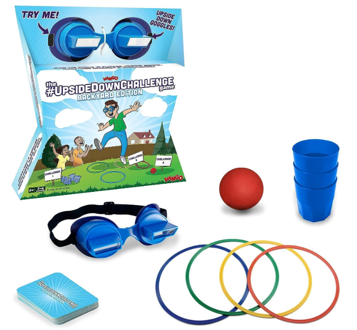 Take the upside-down fun outdoors with the Backyard Edition of the Vango UpsideDownChallenge Game! This laugh-out-loud game includes special goggles that flip your vision, turning simple outdoor tasks like tossing a ball, catching, or drawing on pavement into wacky challenges. When your world is flipped upside down, even the easiest tasks become hilariously hard! With the upside-down goggles on, you’ll find yourself struggling (and laughing) to complete simple outdoor challenges like jumping through rings, catching a ball, or running a relay. Compete with friends and family to see who can handle the flip best and again get ready for nonstop giggles and unforgettable moments! It’s perfect for backyard parties, BBQs, or just getting silly in the sun.