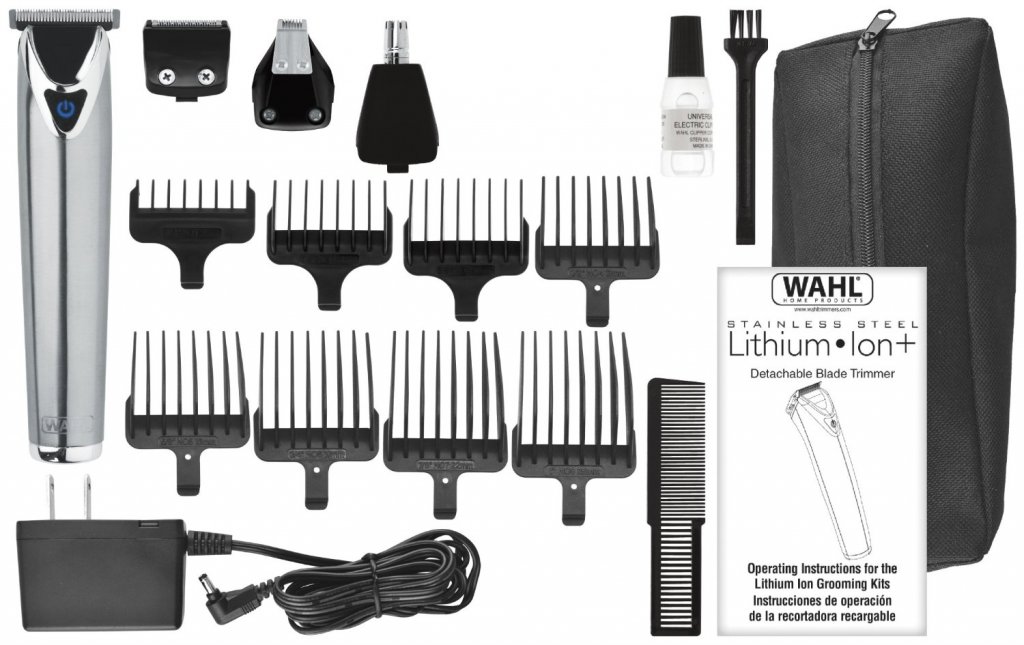 The most awesome Wahl Lithium Ion+ also comes with 3 standard trimmer guides, 8 t-blade guides, a comb, storage pouch, charger, cleaning brush, blade oil, and instructions— the perfect travel companion for your man’s personal care.