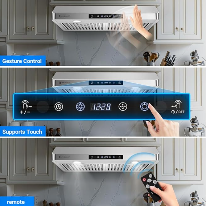 This range hood comes equipped with touchscreen controls, a remote, and even gesture control. Yes, gesture control! I didn’t think I’d use it at first, but it’s actually super convenient. If my hands are dirty from cooking, I just wave my hand in front of the screen to turn the fan on or adjust the speed. No mess, no stress.